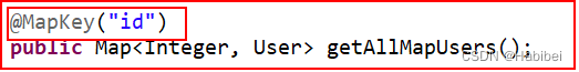 但我们要这样子的结构:Map,Map中的key是User的id,Map的值是User对象,实现它的关键是我们要在接口的方法上加一个注解,告诉Mybatis用哪个字段做Map的key: