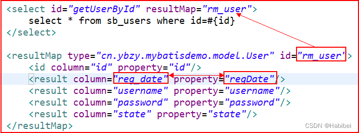 其实两者的关系就是resultType解决数据表上的字段名称和JavaBean上的属性名称不一致的时候,前面介绍了两种方案,①在sql语句上起别名;②设置全局变量mapUnderscoreToCamelCase让符合驼峰命名约定的两个名字建立关联,如JavaBean属性名称regDate对应数据库字段名reg_date;其实这里还有第三种解决方案就是resultMap,它可以让我们指定定义数据库里的字段名称对应JavaBean的属性名称。
