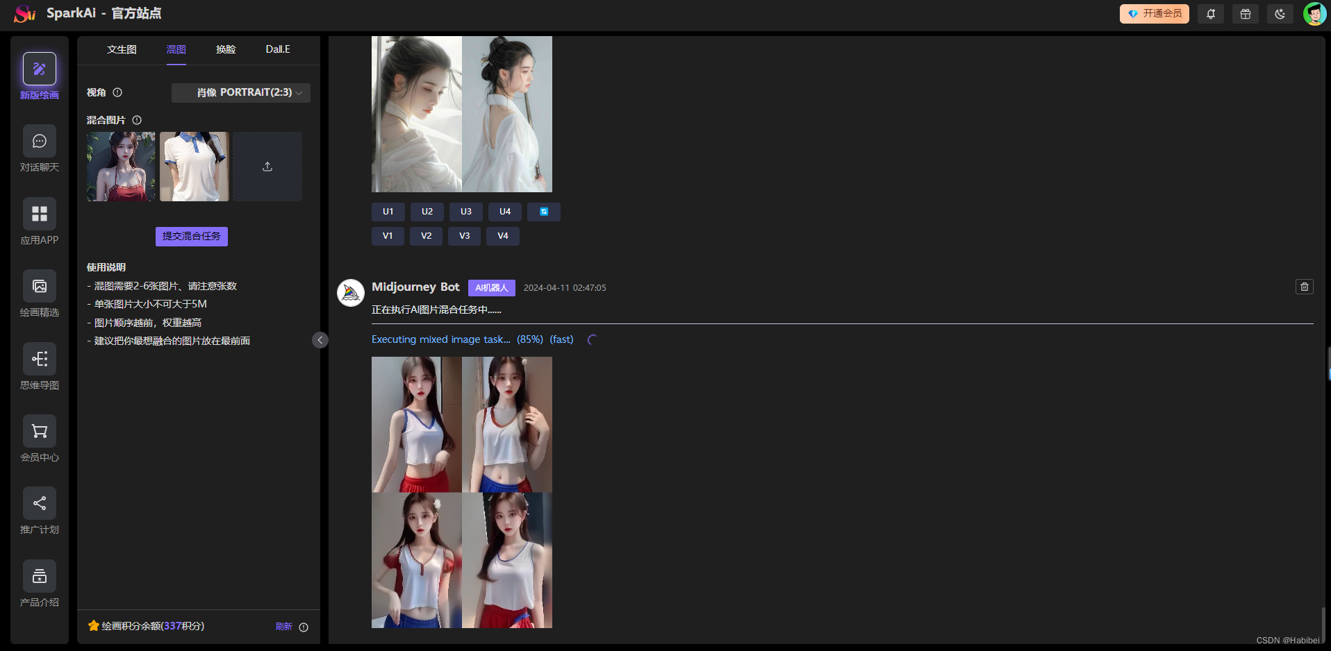 - 💭 专业绘画支持文生图、图生图、垫图混图、角色一致参考图、风格一致参考图生成等、支持AI换脸、支持混合图片。