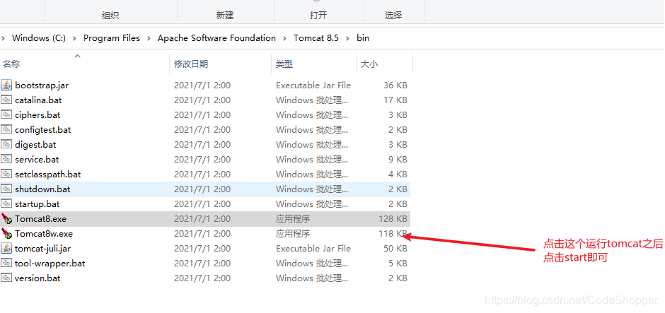 - 启动tomcat是自动开始的,如果输入了端口http://localhost:8080之后还是无法出现对应的tomcat界面,去文件的根目录里面进行手动启动,之后点击start,比如默认的是:C:\Program Files\Apache Software Foundation\Tomcat8.5\bin
