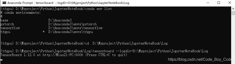 3、启动tensorboard 输入命令 tensorboard --logdir=D:\Myproject\Python\JupyterNoteBook\Log (为你的日志的目录 = 两边不能有空格)