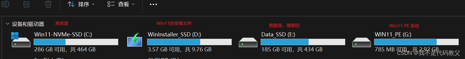 2> 为该第二块固态硬盘进行分区, 分区的数量随意, 但必须要固定有2个分区分别是:10G,用来存放Windows系统的安装文件. (一般就是去官网下载Windows ISO安装包进行解压就行了.) 另外一个分区是3G, 用来存放Win11 PE系统.