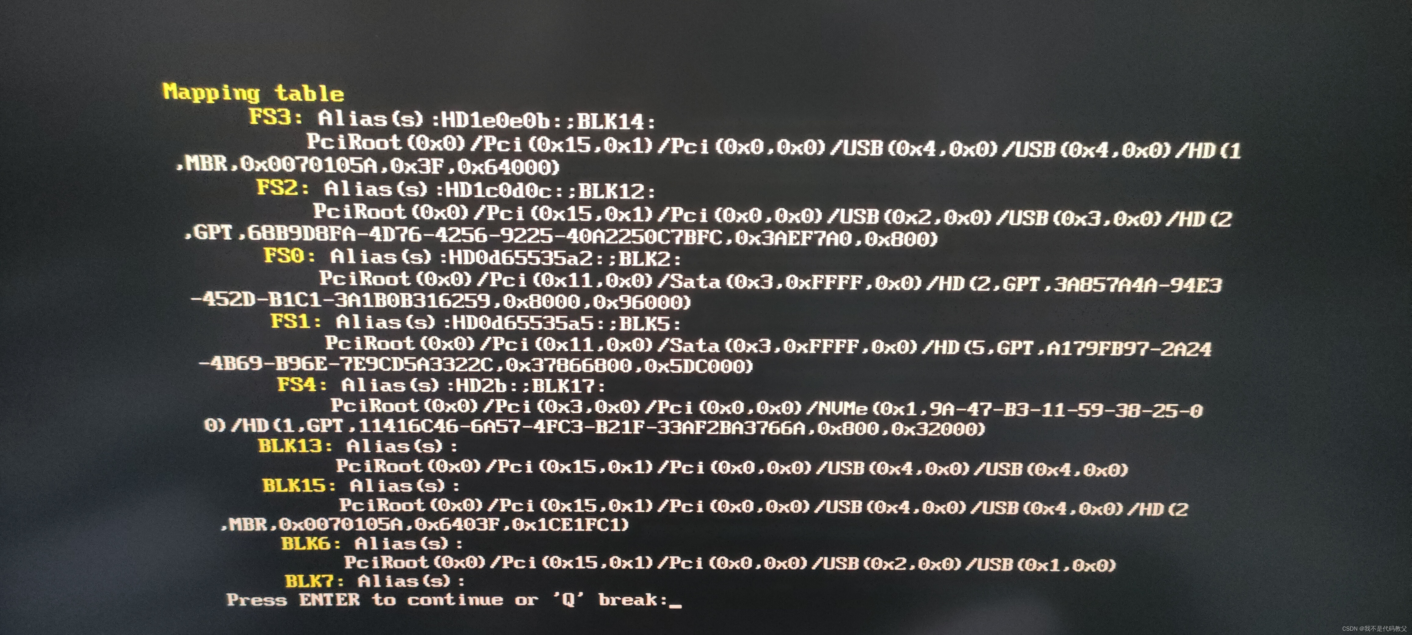 2> 进入"Start UEFI Shell 64"之后,就是一个黑黑的命令提示框, 然后输入 map > map_log.txt 这时map_log.txt会被生成在某个分区的根目录下.
