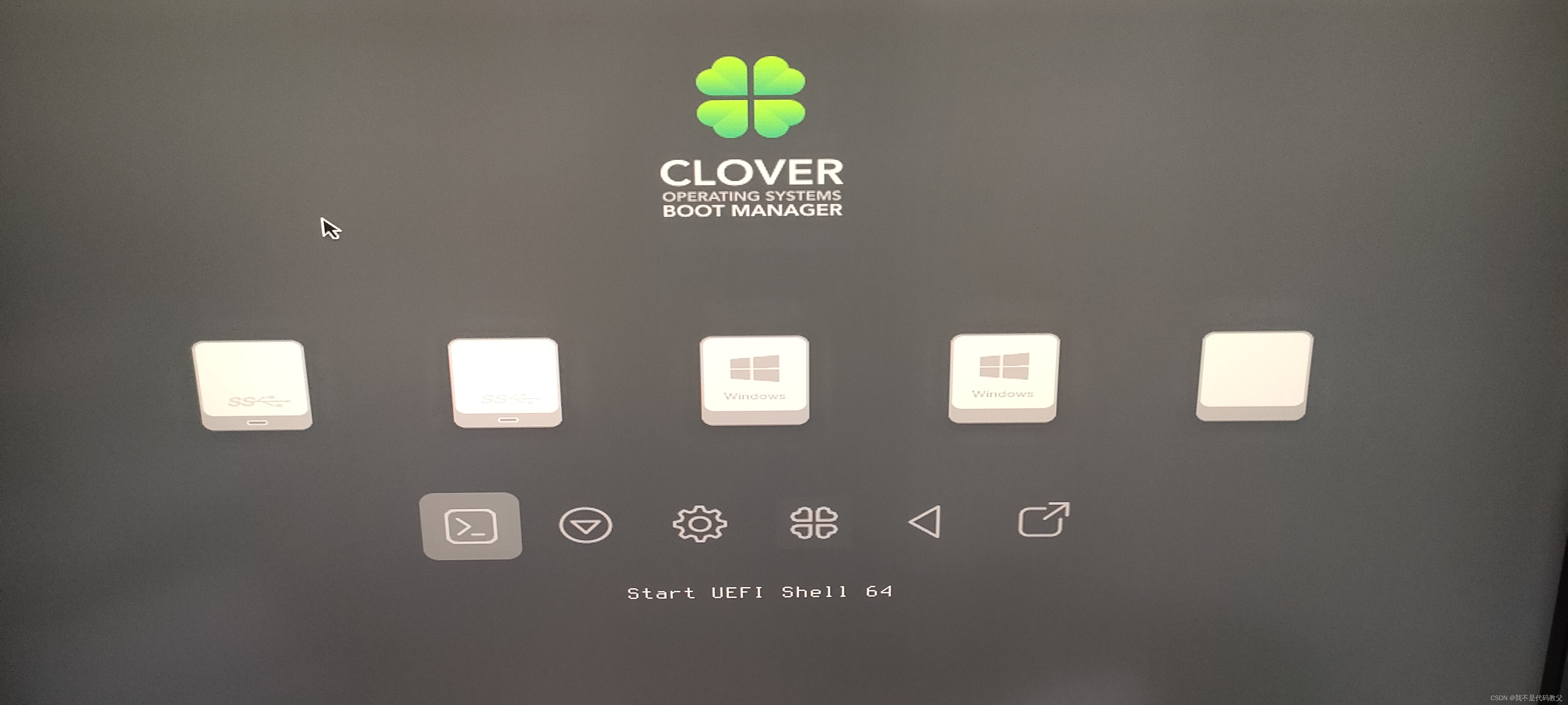 1> 根据我的第一篇文章成功安装Clover引导并进入引导界面之后, 移动光标至左下角第一个图标(文章的结尾会附上图片), 它会显示名称为: Start UEFI Shell 64