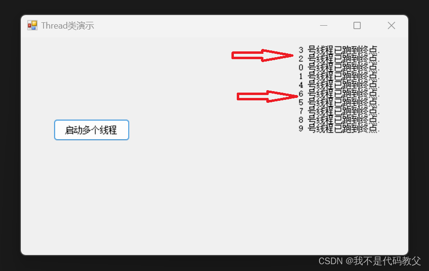 按照上面的3个逻辑步骤尝试去写代码, 编译, 运行. 你发现一个奇怪的现象, 最先创建的0号线程, 并没有能占在第一位去更新label控件. 就有点像平时我们参加10人短跑竞赛的情况, 我虽然第一个起跑了, 但却拿不到的第一名.