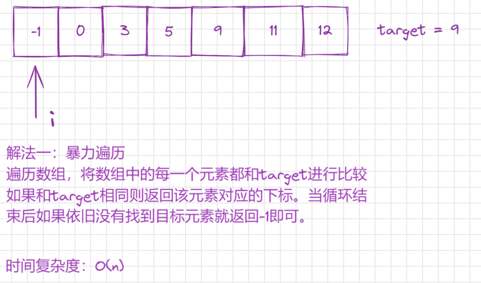 - 我们可以发现我们是将所有的元素都和目标值进行比较那么有没有什么方法可以少比较几次呢?其实是有的,我们可以发现数组是有序的,那么我们可以利用数组有序这个特点(单调性)来进行优化。