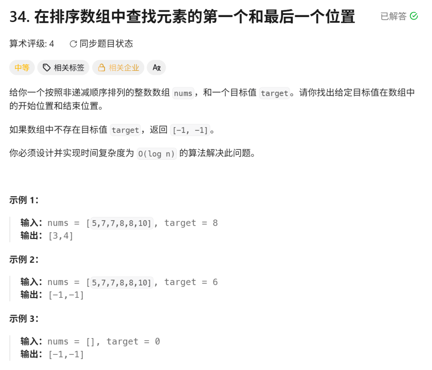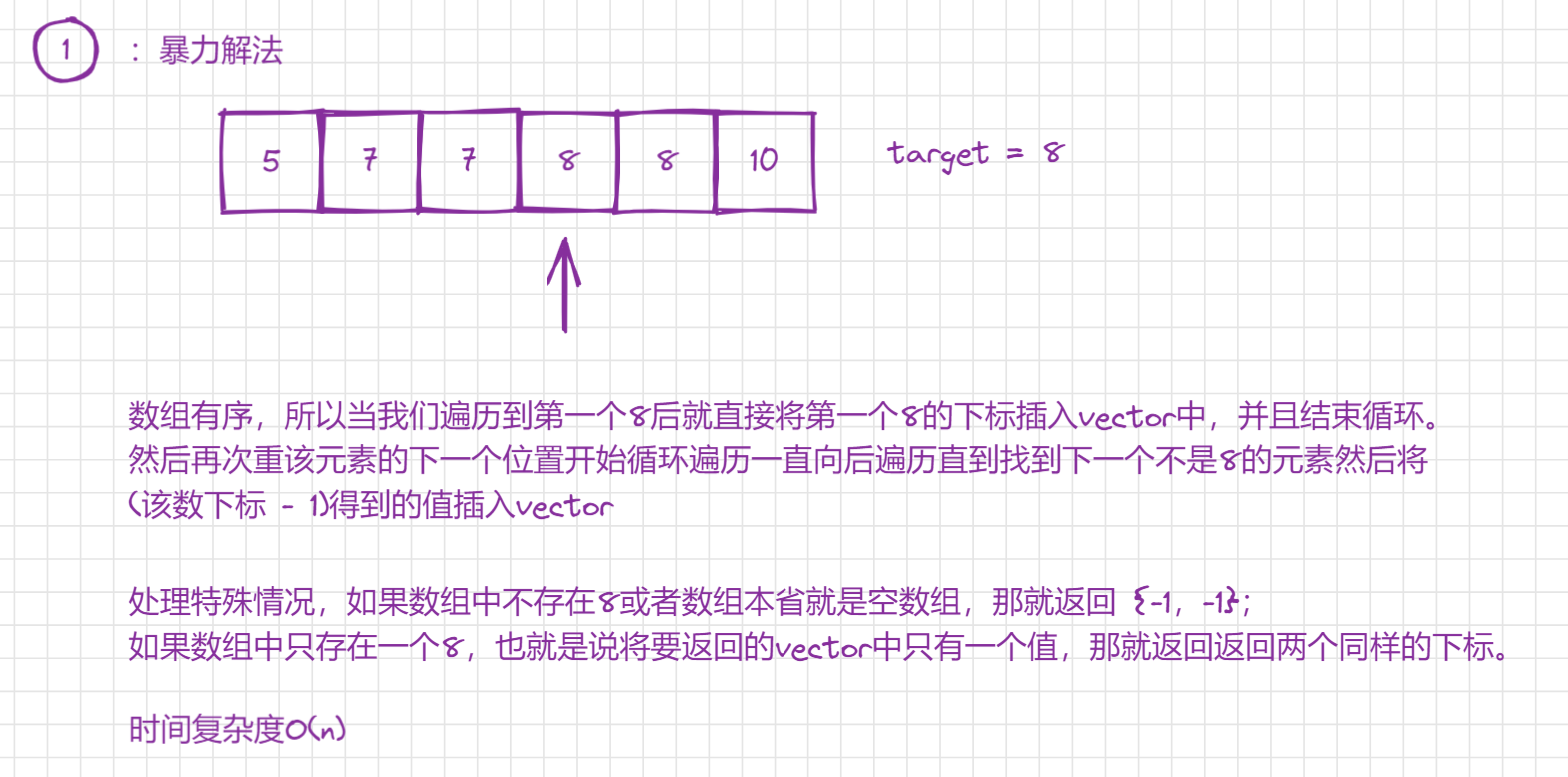 题目分析:题目要求我们返回一个数组中的target元素的开始下标和结束下标。如果没有这个元素或者数组为空就返回{-1, -1};