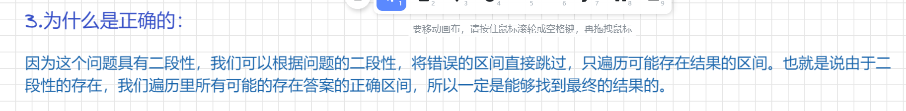 这里要进行一下声明:就是并不是大家公认的只有数组具有单调性才可以使用二分算法,数组具有单调性只是二段性的一种体现,并不能说单调性就是二段性,或者二段性就是单调性。