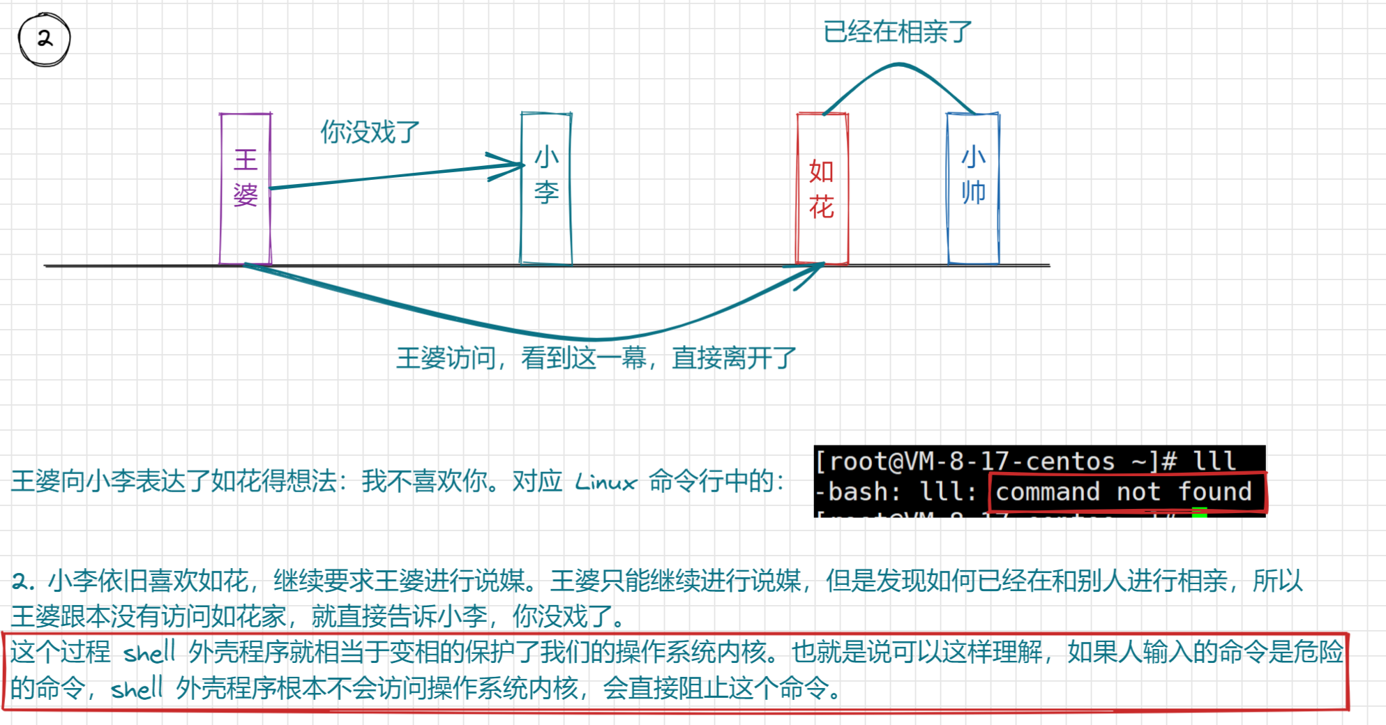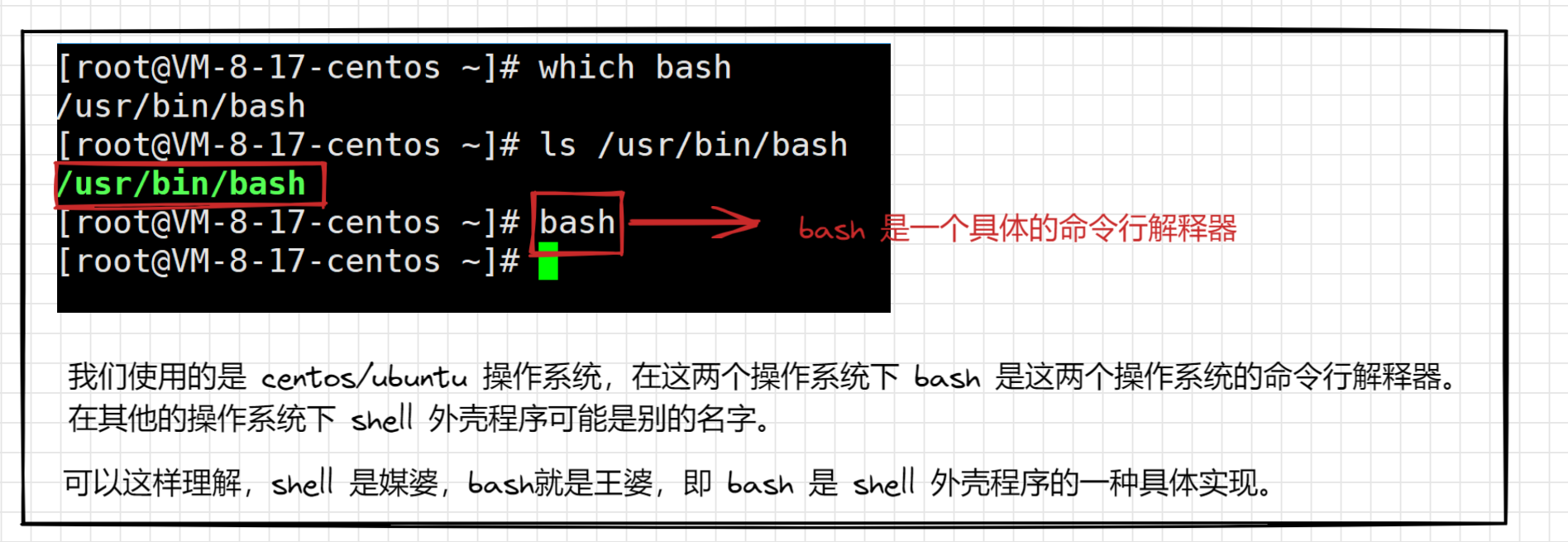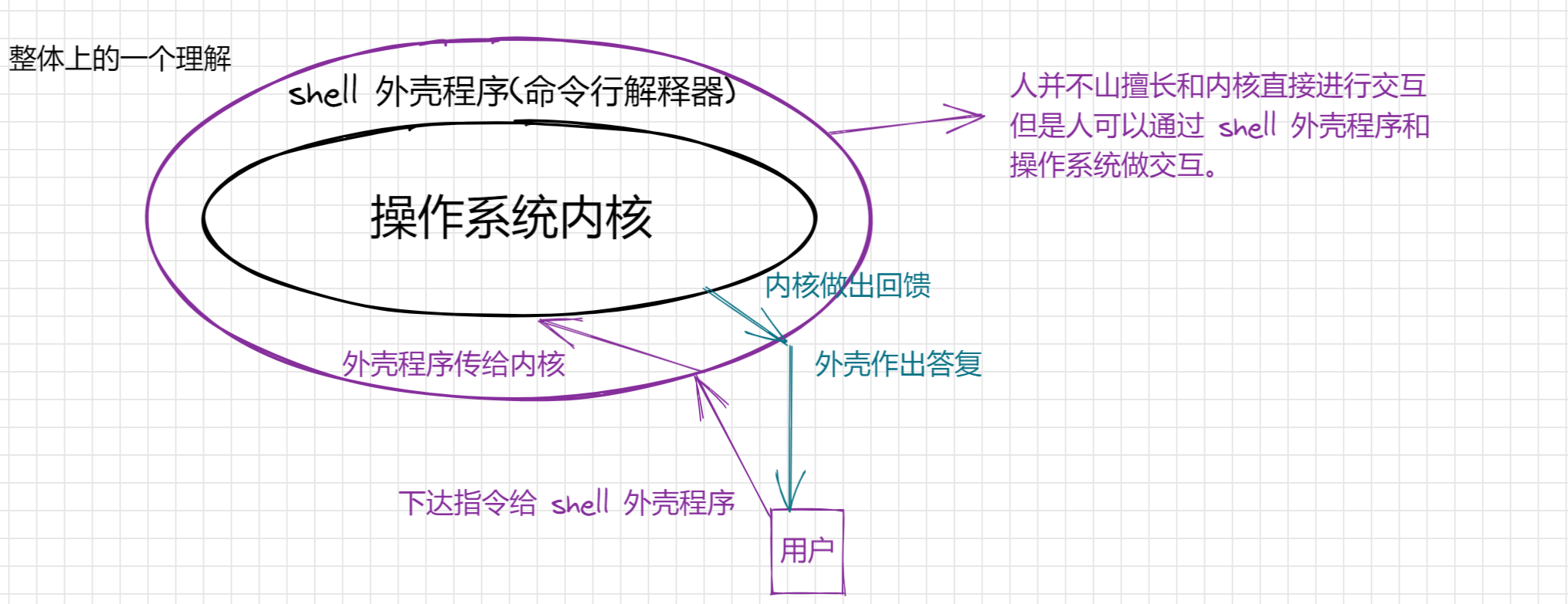 - shell外壳程序的本质,就是shell外壳程序读取用户输入的字符串命令,交给操作系统内核做处理,操作系统内核做出处理后返回给shell外壳程序进而返回给用户。