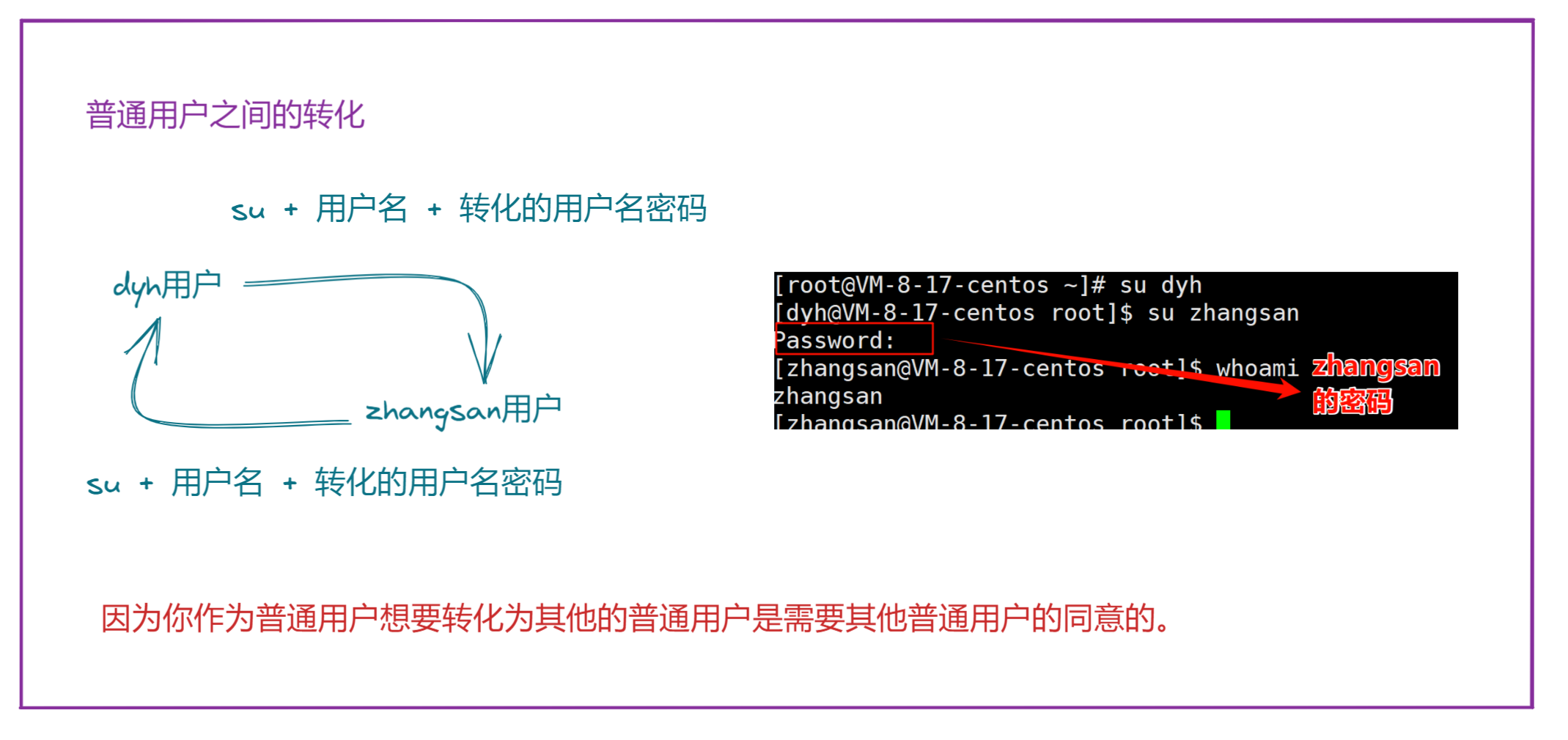 - root最为超级用户是转化为其他用户是不需要密码的,这便是root作为超级用户的特权之一。
