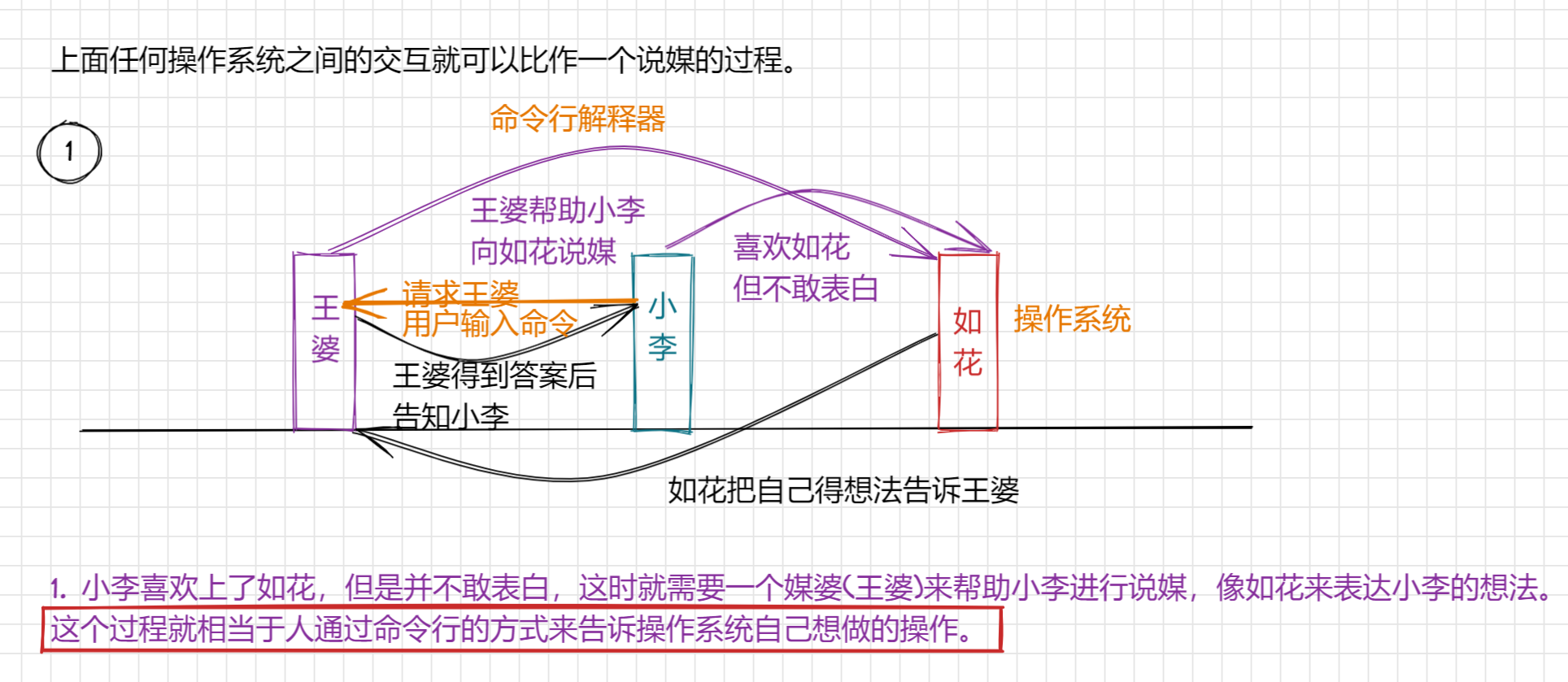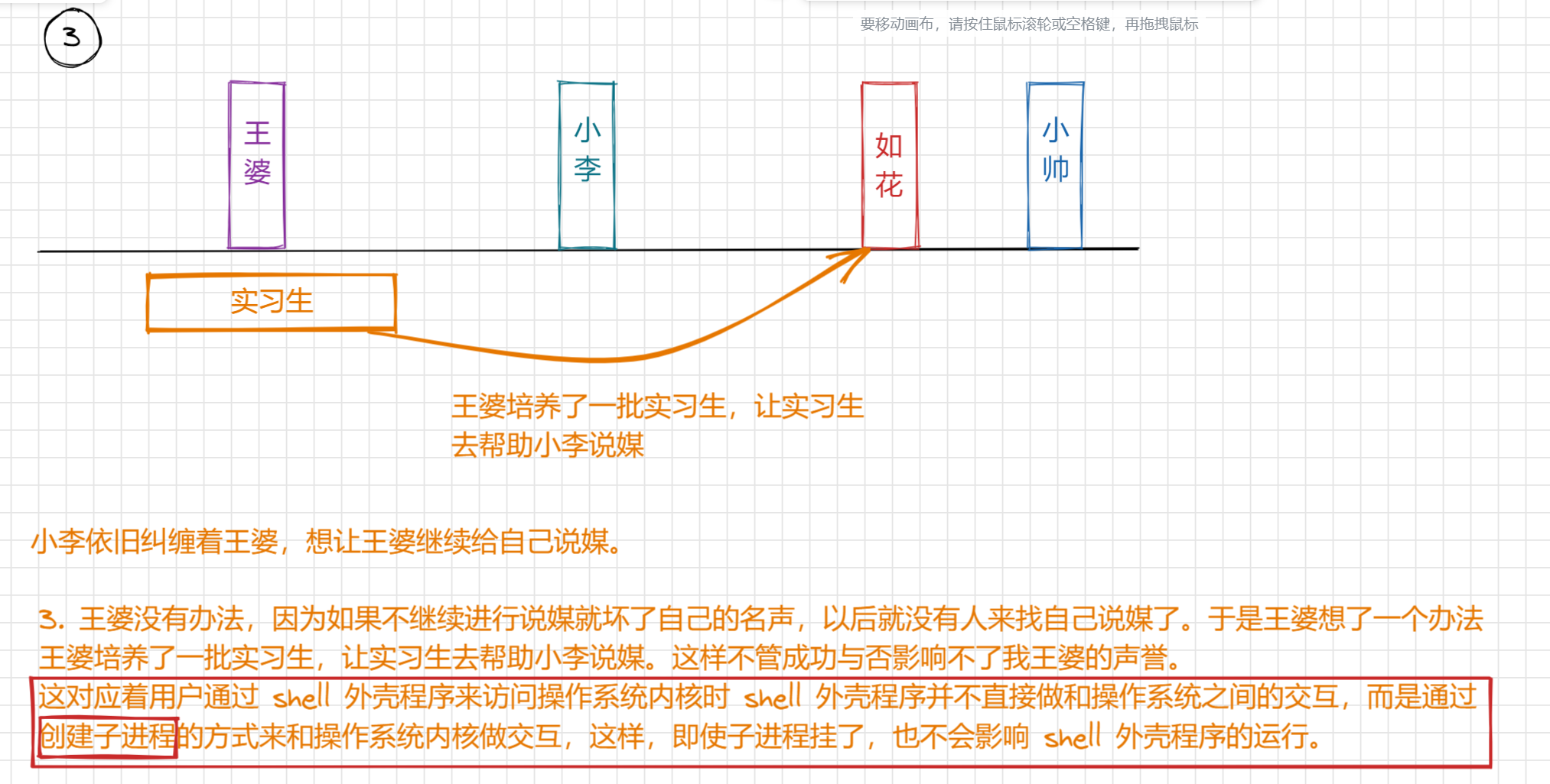 - 用户不擅于和操作系统内核直接进行交互,于是有了shell外壳程序(命令行解释器),shell外壳程序不经帮助用户解决了交互的问题,还间接的保护了操作系统内核,为了不影响shell程序的运行shell通常采用创建子进程的方式来进行命令行解释。
