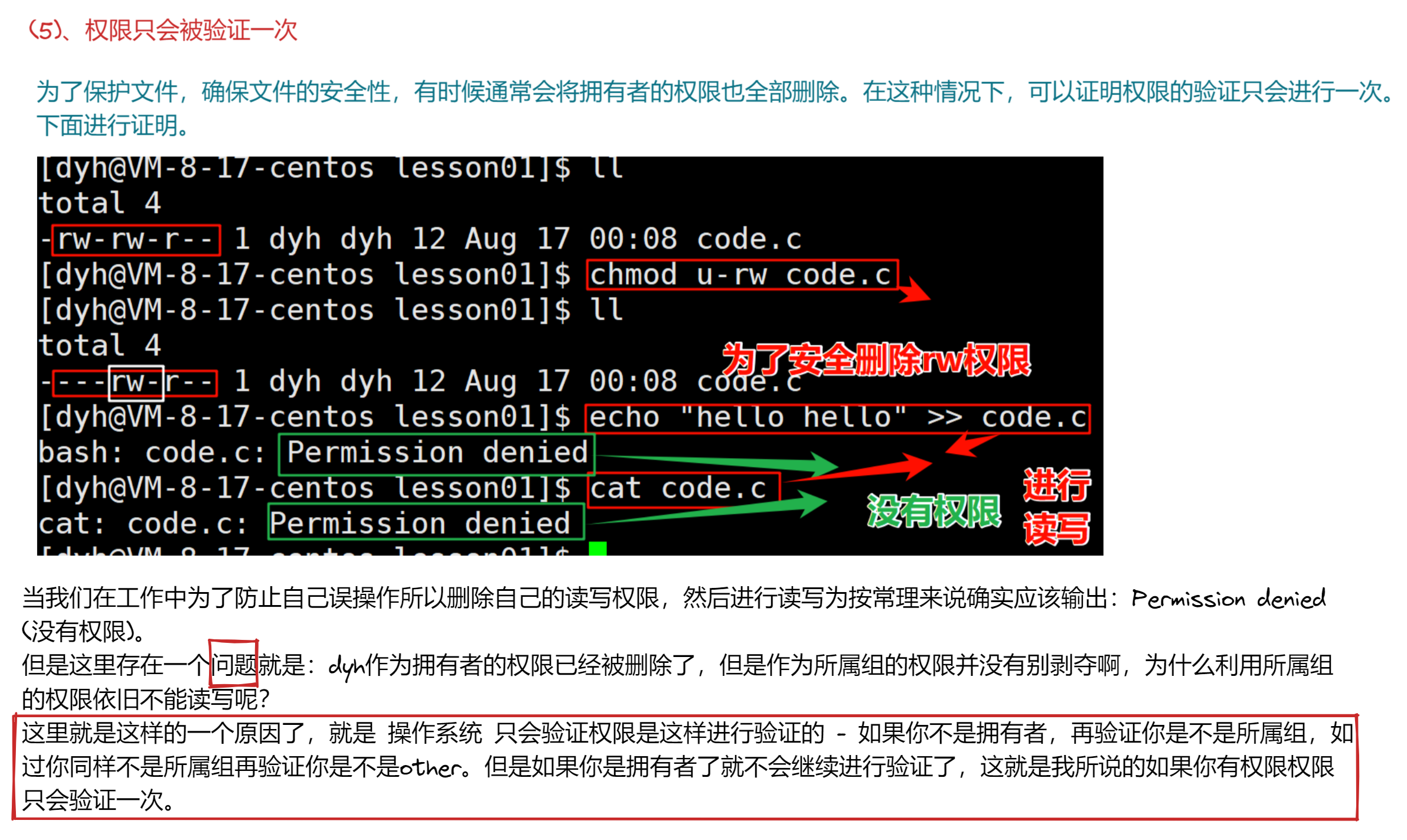 为了保护文件,确保文件的安全性,有时候通常会将拥有者的权限也全部删除。在这种情况下,可以证明权限的验证只会进行一次。下面进行证明。