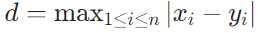 公式:对于两点 A(x1,x2,...,xn) 和 B(y1,y2,...,yn),切比雪夫距离为: