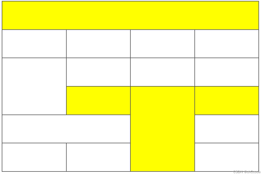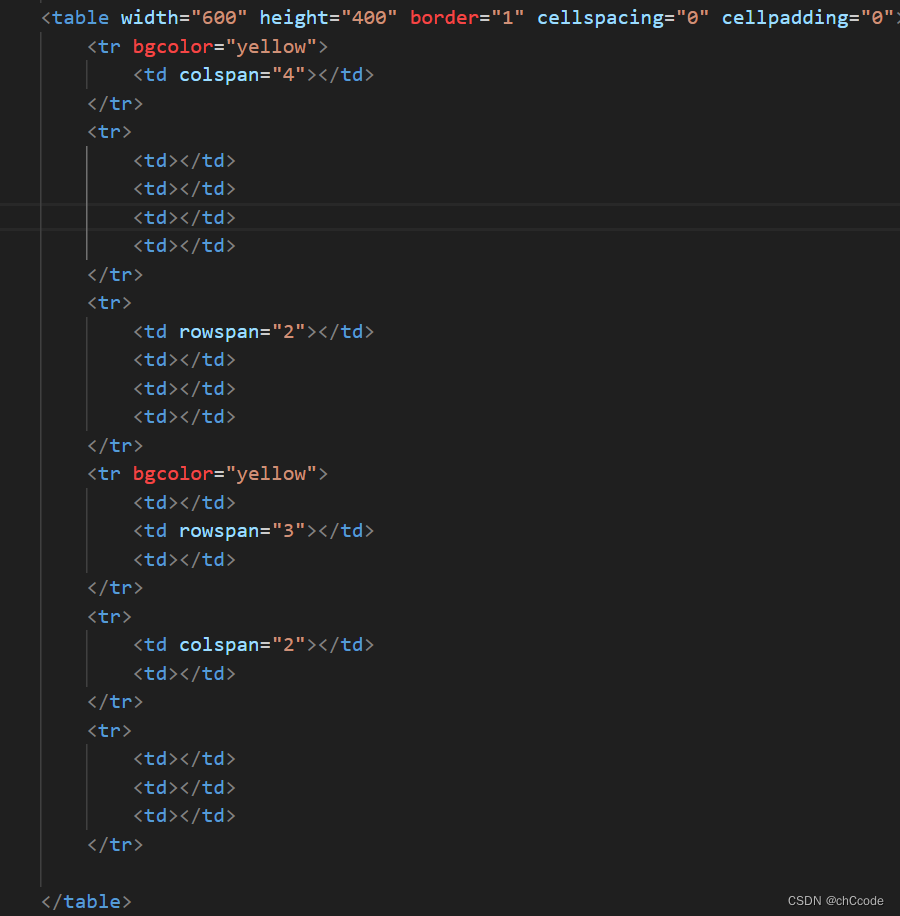 注意第五行有两个单元格需要横向合并,有一个单元格已经被第四行合并走,还有一个不动,所以只有两个<td>