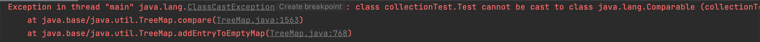 这里抛出了ClassCastException异常。需要我们放入比较器(comparator)