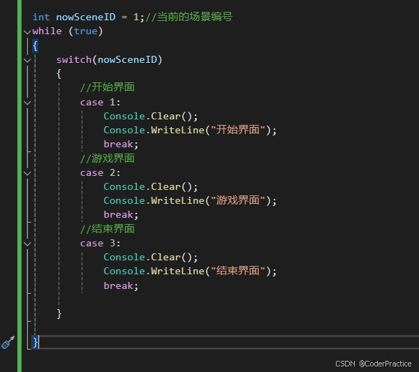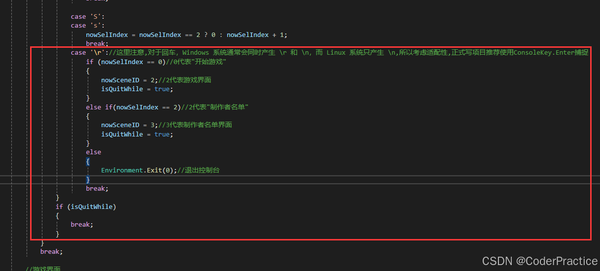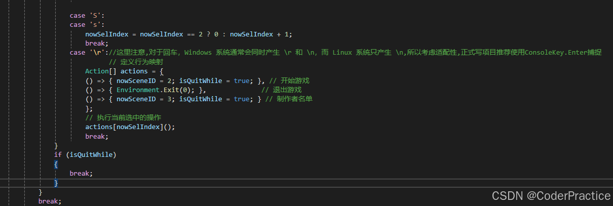 然后我们来设置一下几个判断条件,在对应的条件内部调整界面开关\增加退出条件就搞定了,这里我偷个懒直接case '\r'了,但要注意,比如在linux下面这种是不行的,因为Linux 系统只产生 \n,正式写项目推荐使用ConsoleKey.Enter捕捉.