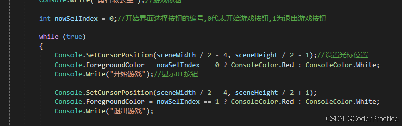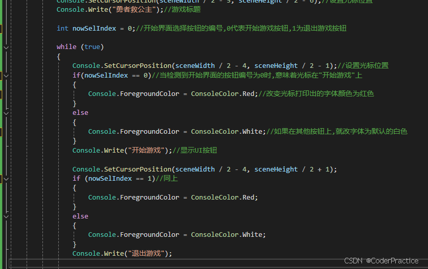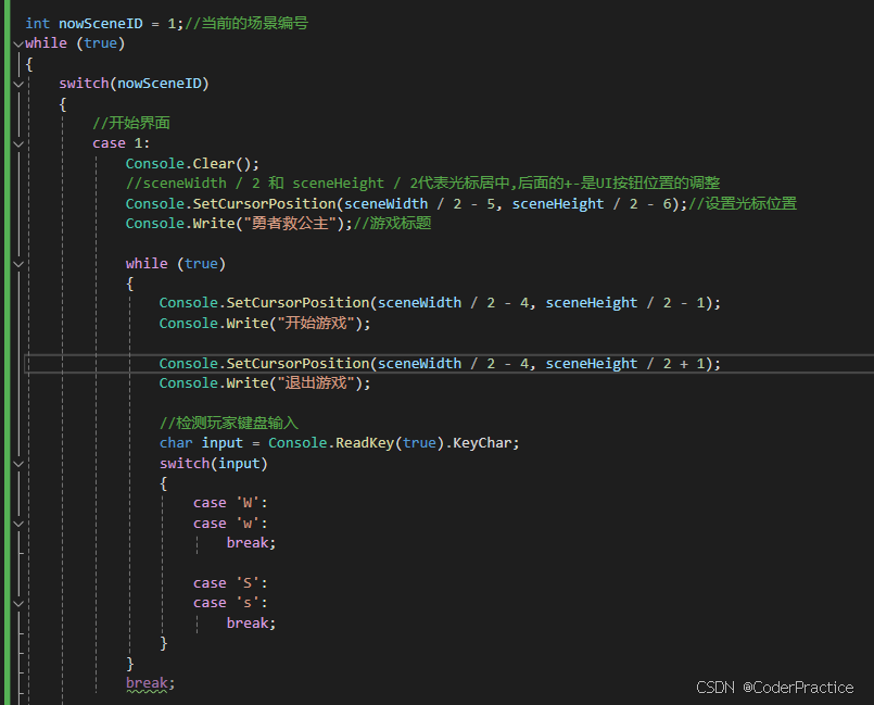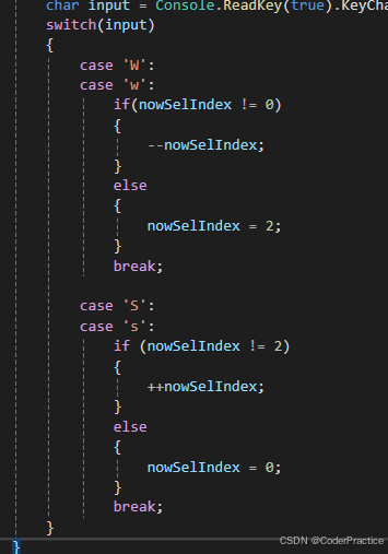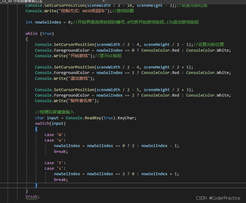 那么到了Console.ReadKey(true)这个位置程序就会停下来等待玩家输入,我们预期玩家能通过W、S两个键来切换开始和退出,并进行选择,这里WS这样写包括大小写避免玩家键盘输入法问题而不能操作,有一个贯穿的知识点,如果不知道就谷歌一下“switch贯穿”。