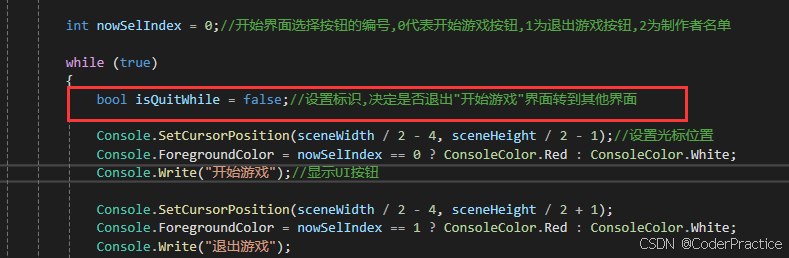 那我们给一个标识isQuitWhile,默认为false,当选中按钮并按下回车后,我们会改变这个弹出标识的状态,标识已经选择过了,可以弹出当前循环
