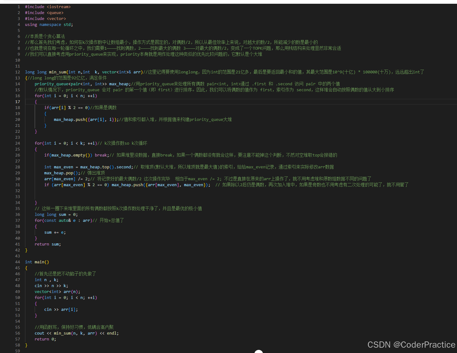 在此基础上还需要注意堆排序和arr实际数据之间的关系,在第一次代码中我采取了priority_queue<int> max_heap;来储存arr数据,然后排序,结果做完发现排序后里堆的数据很难和原本的arr源数据进行操作,后续采用priority_queue<pair<int,int>> max_heap;的方式,first存数据负责堆排序,second存索引负责原地修改数据,然后解决了这个问题