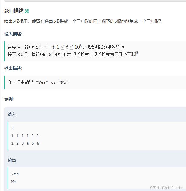 初看感觉是个小贪心,首先确定极值条件,三角形的构成条件是三角不等式——任意两边之和>第三边,所以首先6根中取3根,要找到其中差值最小的那个组合,数据量比较小,可以考虑直接暴力