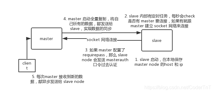 slave node 启动时,会在自己本地保存 master node 的信息,包括 master node 的 host 和 ip ,但是复制流程没开始。
