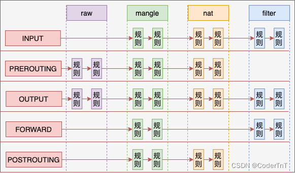 而这些规则根据用途的不同,又可以raw、mangle、nat 和 filter。