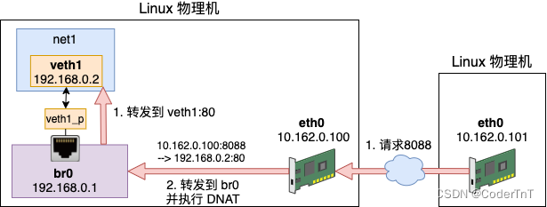 假如说我们有一台 Linux,它的 eth0 的 IP 是10.162.0.100,通过这个 IP 可以访问另外其它服务器。现在我们在这台机器上创建了个 Docker 虚拟网络环境 net1 出来,它的网卡 veth1 的 IP 是 192.168.0.2。