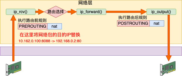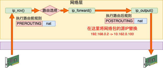 这个过程中,先是经历接收数据的前半段。在 ip_rcv 中经过 PREROUTING 链,然后路由后发现不是本设备的包,那就进入 ip_forward 函数进行转发,在这里又会遇到 FORWARD 链。最后还会进入 ip_output 进行真正的发送,遇到 POSTROUTING 链。