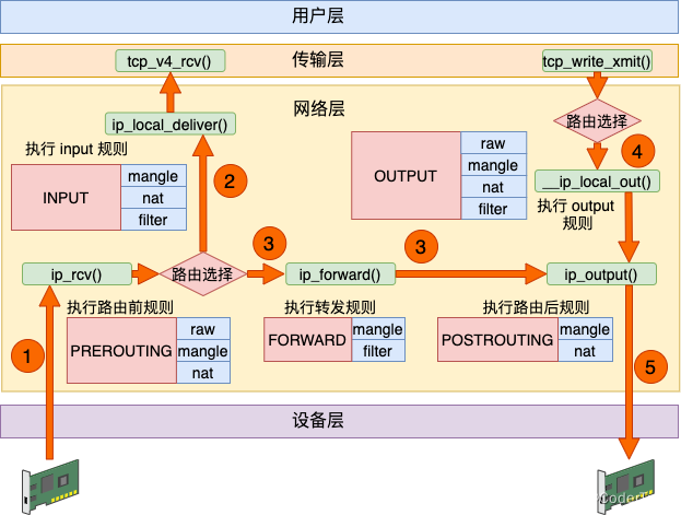 数据接收过程走的是 1 和 2,发送过程走的是 4 、5,转发过程是 1、3、5。有了这张图,我们能更清楚地理解 iptables 和内核的关系。