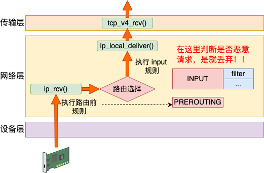 Linux 在网络包接收在 IP 层的入口函数是 ip_rcv。网络在这里包碰到的第一个 HOOK 就是 PREROUTING。当该钩子上的规则都处理完后,会进行路由选择。如果发现是本设备的网络包,进入 ip_local_deliver 中,在这里又会遇到 INPUT 钩子。