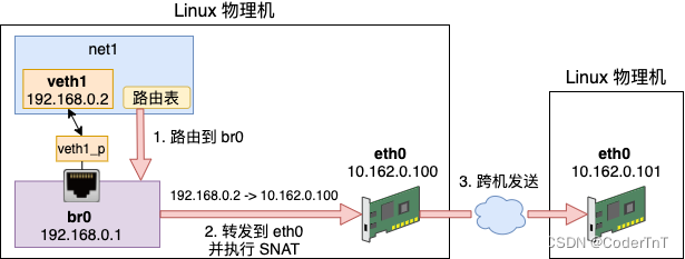 如果想让 192.168.0.2 能访问外部网络,则需要宿主网络命名空间下的设备工作帮其进行网络包转发。由于这是个私有的地址,只有这台 Linux 认识,所以它是无法访问外部的服务器的。这个时候如果想要让 net1 正常访问 10.162.0.101,就必须在转发时执行 SNAT - 源地址替换。