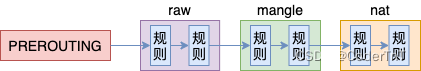 例如在 PREROUTING 链中的规则中,分别可以执行 raw、mangle 和 nat 三种功能。