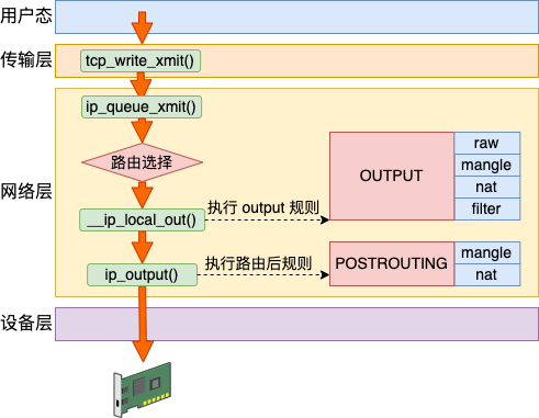 Linux 在网络包发送的过程中,首先是发送的路由选择,然后碰到的第一个 HOOK 就是 OUTPUT,然后接着进入 POSTROUTING 链。