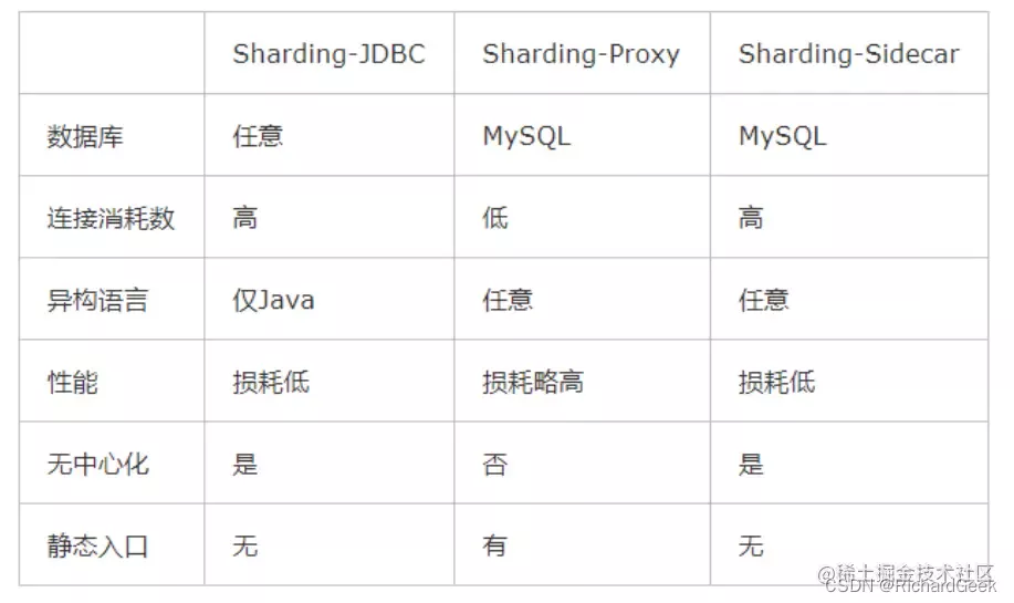 Sharding-JDBC、Sharding-Proxy和Sharding-Sidecar三者区别如下: