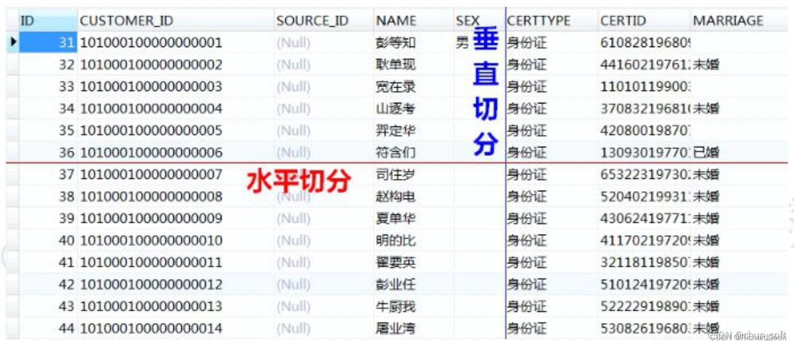 垂直切分:基于表或字段划分,表结构不同。我们有单库的分表,也有多库的分表。
