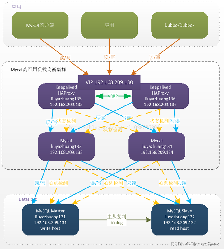 无论是client模式,还是proxy模式,几个核心的步骤是一样的:SQL解析,重写,路由,执行,结果归并。个人比较倾向于采用client模式,它架构简单,性能损耗也比较小,运维成本低。如果在项目中引入mycat或者cobar,他们的单机模式无法保证可靠性,一旦宕机则服务就变得不可用,你又不得不引入HAProxy来实现它的高可用集群部署方案, 为了解决HAProxy的高可用问题,又需要采用Keepalived来实现。