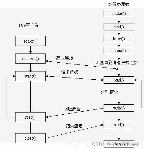 先从服务器端说起。服务器端先初始化Socket,然后与端口绑定(bind),对端口进行监听(listen),调用accept阻塞,等待客户端连接。在这时如果有个客户端初始化一个Socket,然后连接服务器(connect),如果连接成功,这时客户端与服务器端的连接就建立了。客户端发送数据请求,服务器端接收请求并处理请求,然后把回应数据发送给客户端,客户端读取数据,最后关闭连接,一次交互结束。
