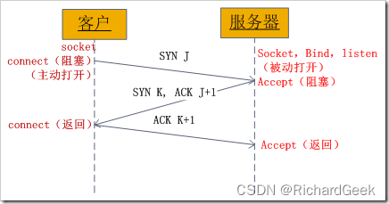 从图中可以看出,当客户端调用connect时,触发了连接请求,向服务器发送了SYN J包,这时connect进入阻塞状态;服务器监听到连接请求,即收到SYN J包,调用accept函数接收请求向客户端发送SYN K ,ACK J+1,这时accept进入阻塞状态;客户端收到服务器的SYN K ,ACK J+1之后,这时connect返回,并对SYN K进行确认;服务器收到ACK K+1时,accept返回,至此三次握手完毕,连接建立。