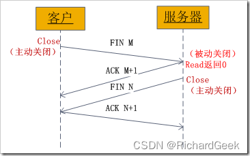 某个应用进程首先调用close主动关闭连接,这时TCP发送一个FIN M;