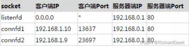 而一旦accept 新的连接, 新的connfd 就会生成, 像下面的表格, 就生成了两个connfd , 它们俩服务器端的ip和port都是相同的, 但是客户端的IP和Port是不同的, 自然就可以区分开来了。