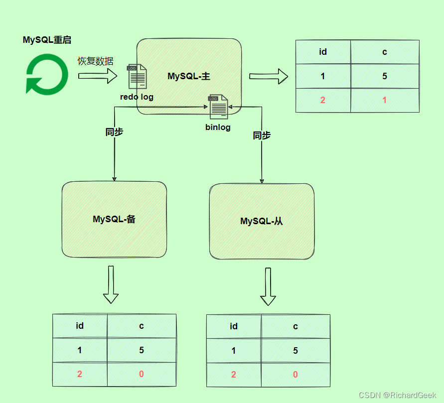 由于binlog没写完就异常,这时候binlog里面没有对应的修改记录。因此,之后用binlog日志恢复数据时,就会少这一次更新,恢复出来的这一行c值是0,而原库因为redo log日志恢复,这一行c值是1,最终数据不一致。