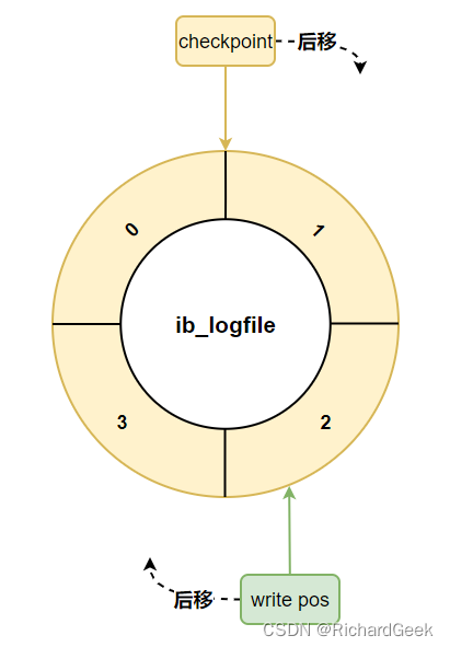 每次刷盘 redo log 记录到日志文件组中,write pos 位置就会后移更新。