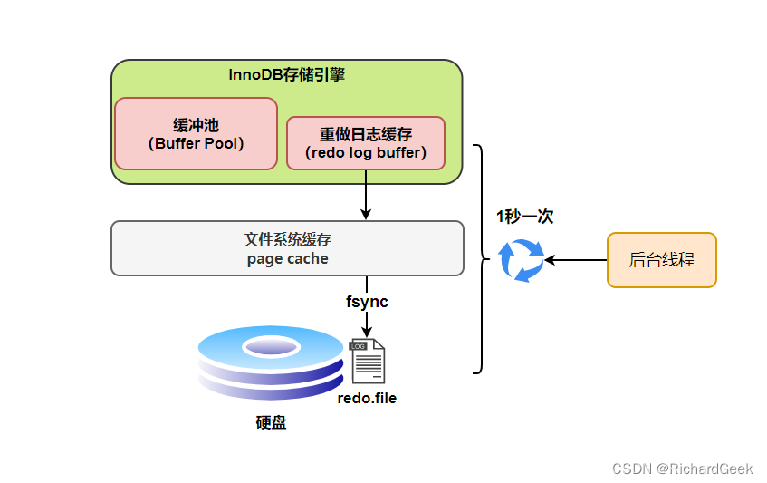innodb_flush_log_at_trx_commit 参数默认为 1 ,也就是说当事务提交时会调用 fsync 对 redo log 进行刷盘。另外,InnoDB 存储引擎有一个后台线程,每隔1 秒,就会把 redo log buffer 中的内容写到文件系统缓存(page cache),然后调用 fsync 刷盘。