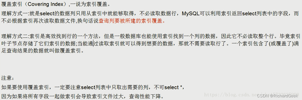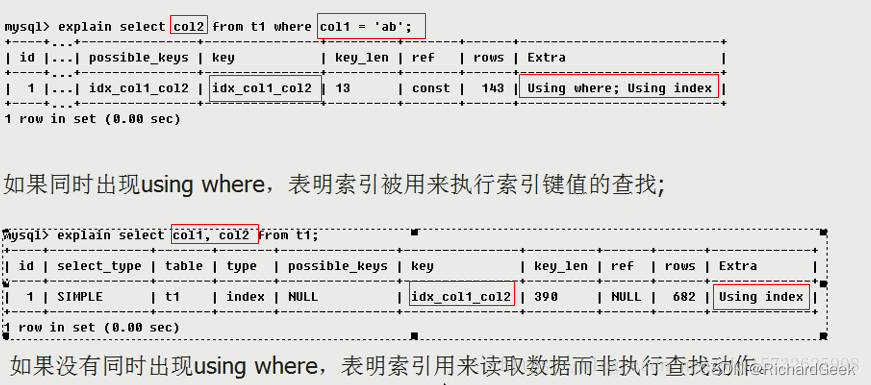 表示相应的select操作中使用了覆盖索引(Covering Index),避免访问了表的数据行,效率不错。如果同时出现using where,表明索引被用来执行索引键值的查找;如果没有同时出现using where,表明索引用来读取数据而非执行查找动作。