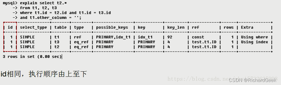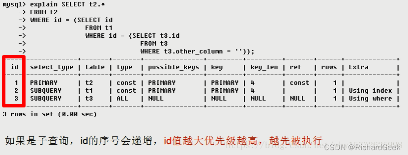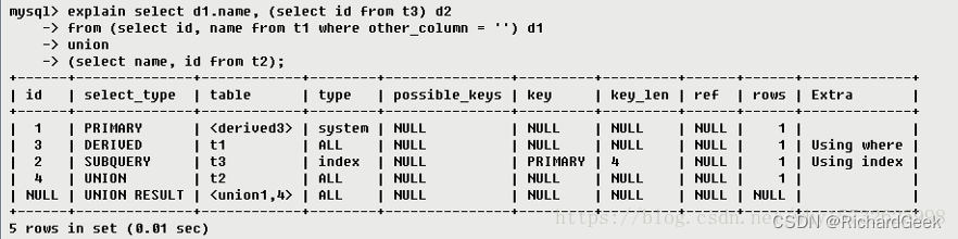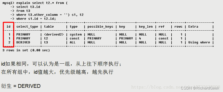 - 执行顺序2:id为3,是整个查询中第三个select的一部分。因查询包含在from中,所以为DERIVED【select id,name from t1 where other_column=’’】