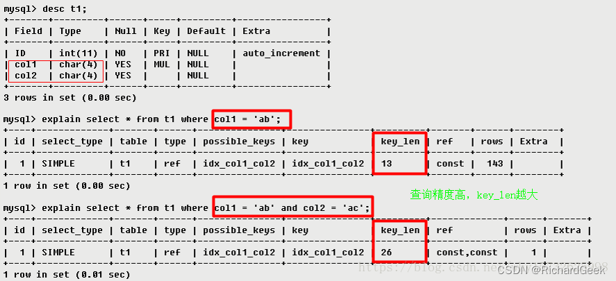 表示索引中使用的字节数,可通过该列计算查询中使用的索引的长度,在不损失精确性的情况下,长度越短越好。key_len显示的值为索引字段的最大可能长度,并非实际使用长度,即key_len是根据表定义计算而得,不是通过表内检索出的。