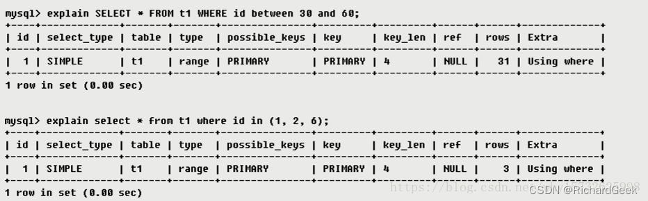 range只检索给定范围的行,使用一个索引来选择行,key列显示使用了哪个索引,一般就是在你的where语句中出现between、< 、>、in等的查询,这种范围扫描索引比全表扫描要好,因为它只需要开始于索引的某一点,而结束于另一点,不用扫描全部索引。