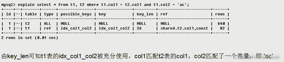 显示索引的那一列被使用了,如果可能的话,最好是一个常数。哪些列或常量被用于查找索引列上的值。