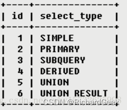 - UNION 若第二个SELECT出现在UNION之后,则被标记为UNION:若UNION包含在FROM子句的子查询中,外层SELECT将被标记为:DERIVED