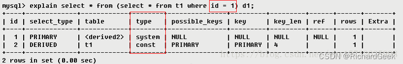 首先进行子查询得到一个结果的d1临时表,子查询条件为id = 1 是常量,所以type是const,id为1的相当于只查询一条记录,所以type为system。 eq_ref唯一性索引扫描,对于每个索引键,表中只有一条记录与之匹配。常见于主键或唯一索引扫描ref非唯一性索引扫描,返回匹配某个单独值的所有行,本质上也是一种索引访问,它返回所有匹配某个单独值的行,然而,它可能会找到多个符合条件的行,所以他应该属于查找和扫描的混合体。